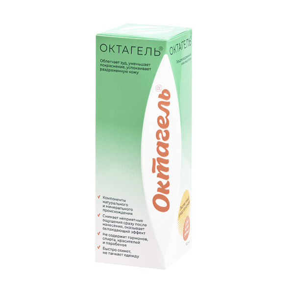 Компоненты растительного и минерального происхождения способствуют уменьшению зуда, отека и воспаления, успокаивают кожу, оказывают антимикробное, охлаждающее и подсушивающее действия, ускоряют ее заживление и предотвращают образование рубцов. Октагель подходит для использования на участках кожи любой площади.