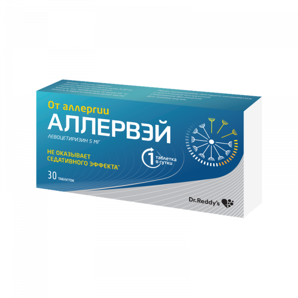 Аллервэй — таблетки противоаллергического действия. Препарат показан для лечения поллиноза, крапивницы, дерматозов и снятия симптомов ринитов и конъюнктивита. Средство нельзя принимать пациентам с непереносимостью лактозы, гиперчувствительностью, почечной недостаточностью в терминальной стадии и детям в возрасте до 6 лет. Побочные действия: судороги, вертиго, нарушения зрения, тошнота, диарея.