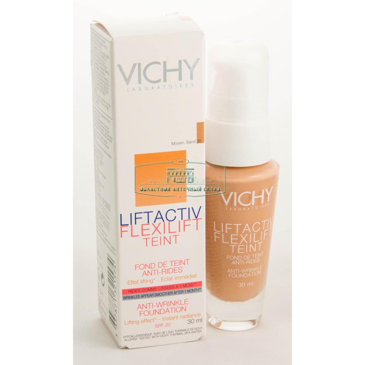 Описание\x0A\x0AФлексилифт тональный крем против морщин - подтягивающая текстура на силиконовой основе обеспечивает легкое и равномерное нанесение крема. Благодаря своим "эластичным" свойствам силиконовая текстура следует за естественными движениями лица, не стягивая кожу, и на протяжении всего дня не позволяет тональному крему скапливаться в морщинах и подчеркивать их. В формулу крема входит инновационный комплекс Коллагил, содержащий в своем составе Аденозин, изофлавоны сои и Амиконин, разглаживающие морщины в течение 1 месяца.\x0A\x0AПоказания\x0A\x0AРекомендуется с 35-40 лет. Наносить кончиками пальцев на кожу лица и шеи. Распределять от внутренней к внешней стороне лица. Для получения более естественного результата растушевать крем на шее, около ушей и вдоль линии роста волос. Крем легко удаляется с помощью очищающих средств линии ПЮРТЭ ТЕРМАЛЬ Лаборатории VICHY.\x0A\x0AОсновные компоненты\x0A\x0AКоллагил, магния сульфат, карнаубский воск, диоксид титана (SPF 20), термальная вода VICHY (Виши).